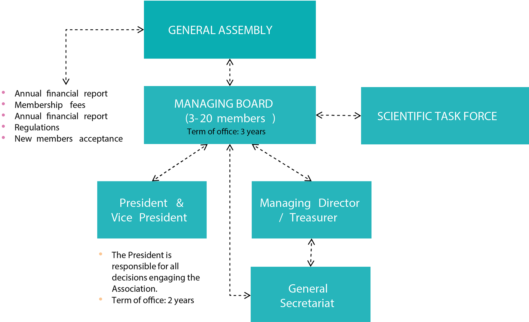 - The Managing Board (3-20 members, elected for three years) takes care of the big decisions: approving the annual financial report, setting membership fees, adopting regulations, and welcoming new members.